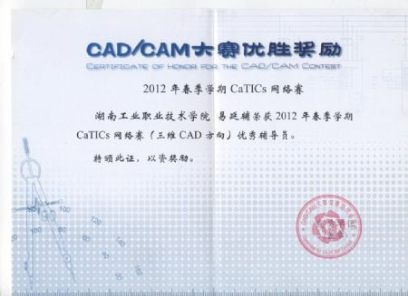 易延辅老师获2012年全国CAD/CAM大赛 优秀辅导员奖 | |