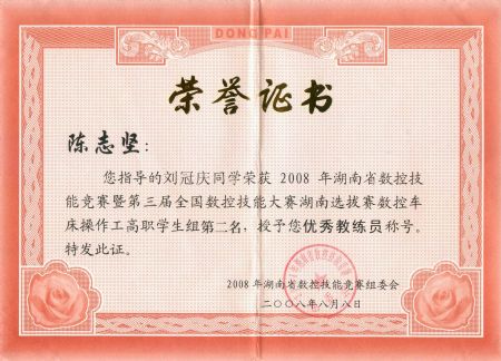 | 陈志坚老师在2008年在湖南数控技能大赛中被评为湖南省队优秀教练员 | |