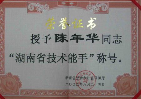 | 陈年华老师被湖南省人力资源和社会保障厅授予“湖南省技术能手”称号 | |