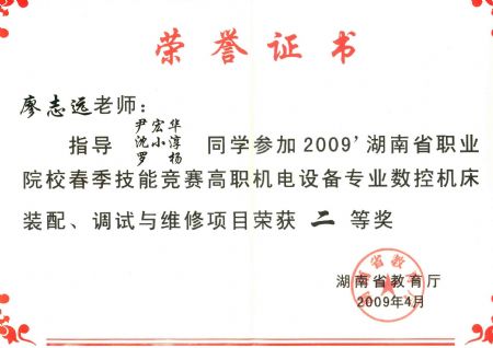 廖志远老师获2009年湖南数控技能大赛 指导奖 | |