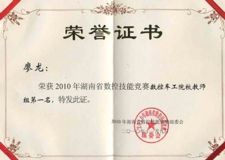 廖龙老师获2010年湖南数控技能大赛 车工组第一名 | |