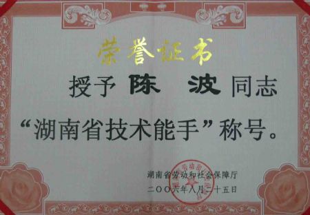 | 陈波老师被湖南省人力资源和社会保障厅授予“湖南省技术能手”称号 | |