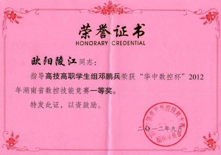 | 欧阳陵江老师获2012年湖南数控技能大赛指导奖 | |