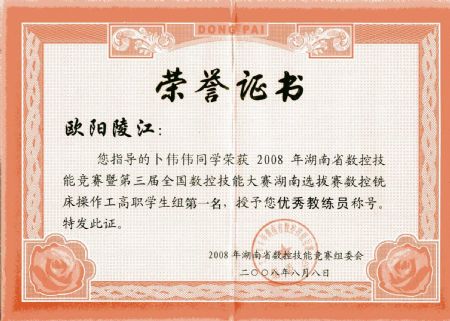 | 欧阳陵江老师在2008年在湖南数控技能大赛中被评为湖南省队优秀教练员 | |