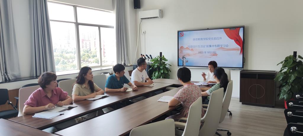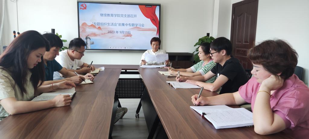 9月11日继续教育学院党支部在行政楼601会议室召开了“关于在学习贯彻习近平新时代中国特色社会主义思想主题教育中开好专题组织生活会”前集中专题学习会。党支部书记龙华主持本次活动,继续教育学院党支部全体党员参学,入党积极分子邹旻、群众代表王易列席。