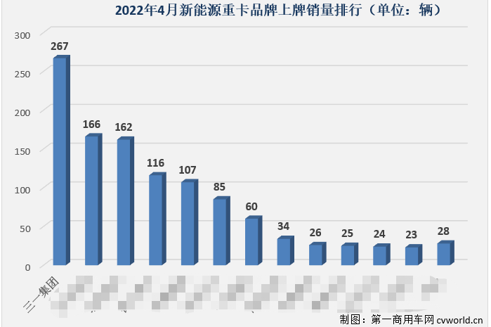 其中4月,三一新能源重卡上牌销量267辆,以超第二名101辆的优势跃居市场月销量榜第一。