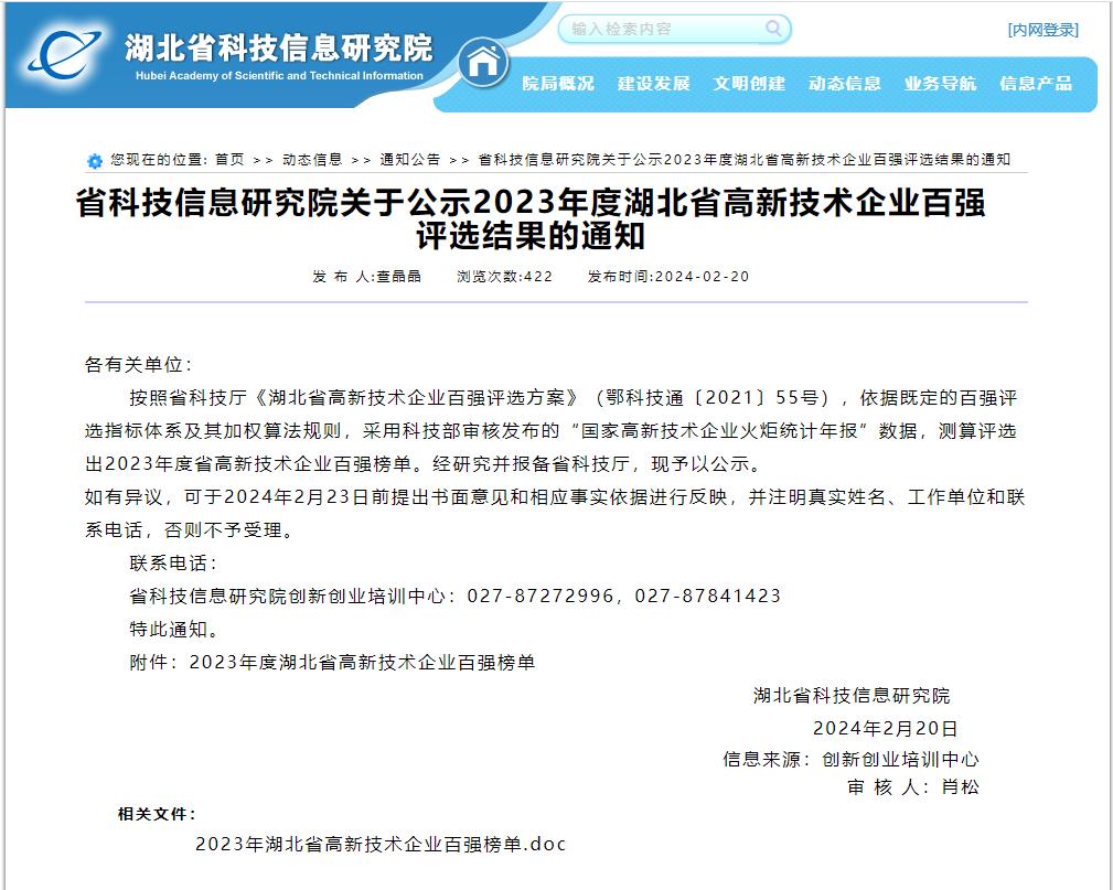 近日,湖北省科技信息研究院发布《省科技信息研究院关于公示2023年度湖北省高新技术企业百强评选结果的通知》,武汉华中数控股份有限公司入选2023年度湖北省高新技术企业百强名单。