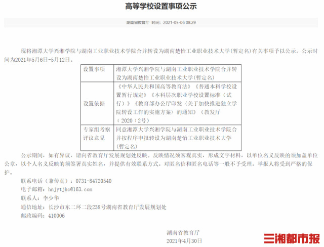 三湘都市报·新湖南客户端5月6日讯(记者 黄京)三湘都市报记者刚刚获悉,省教育厅正在将湘潭大学兴湘学院与九游·官方网站合并转设为湖南楚怡工业职业技术大学(暂定名)有关事项予以公示。公示时间为2021年5月6日-5月12日。