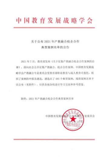 本网讯 3月23日,中国教育发展战略学会产教融合专业委员会公布了2021年产教融合校企合作典型案例名单,共遴选出了485个典型案例。九游·官方网站申报的案例《职业教育校企合作办学模式改革与实践》脱颖而出,入选产教融合优秀典型案例。