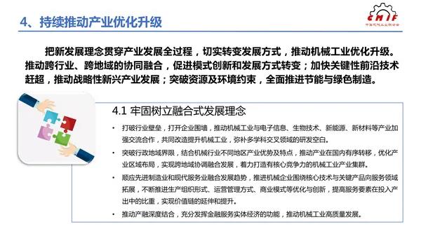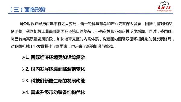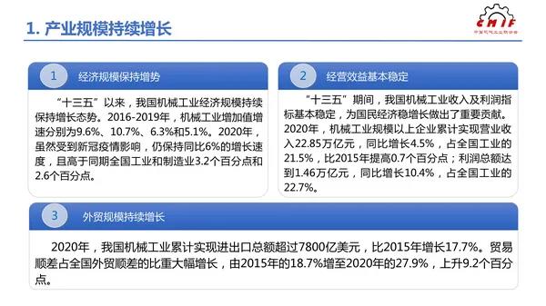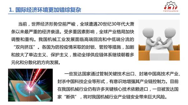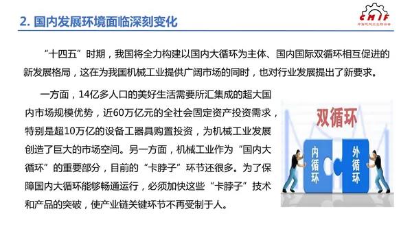 摘要:2021年4月15日,中国机械工业联合会四届八次会员大会在京隆重召开,在下午举行的经济形势和“十四五”规划解读专题报告会上,中国机械联执行副会长陈斌就宏观经济形势和机械工业“十四五”规划作了专题报告。现将报告的PPT发布稿刊登如下,供大家学习参考。