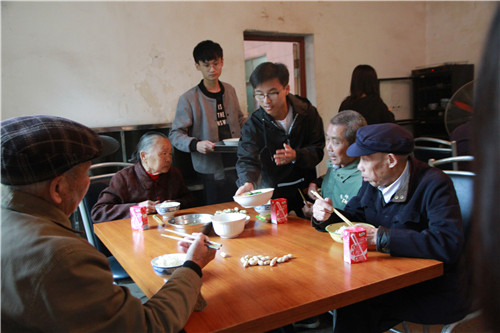大家提着一大堆日常必备的粮油、补充营养的牛奶、零食等走进敬老院,陪他们聊天话家常、打扫庭院的落叶。有厨艺不错的同学,拿着大锅勺下厨,为老人们送上美味可口的家常菜,赢得大家好评连连。