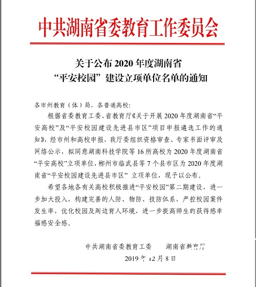 在“平安高校”项目申报期间,我校保卫处、二级学院及相关部门相互配合,根据省委教育工委、省教育厅《关于开展2020年度湖南省“平安高校”及“平安校园建设先进县市区”项目申报遴选工作的通知》的相关要求,积极开展申报工作。经过资格审查、专家书面评审及网络公示环节等多个环节,我校等16所高校获批为2020年度湖南省“平安高校”立项单位,郴州市临武县等7个县市区获批为2020年度湖南省“平安校园建设先进县市区” 立项单位。