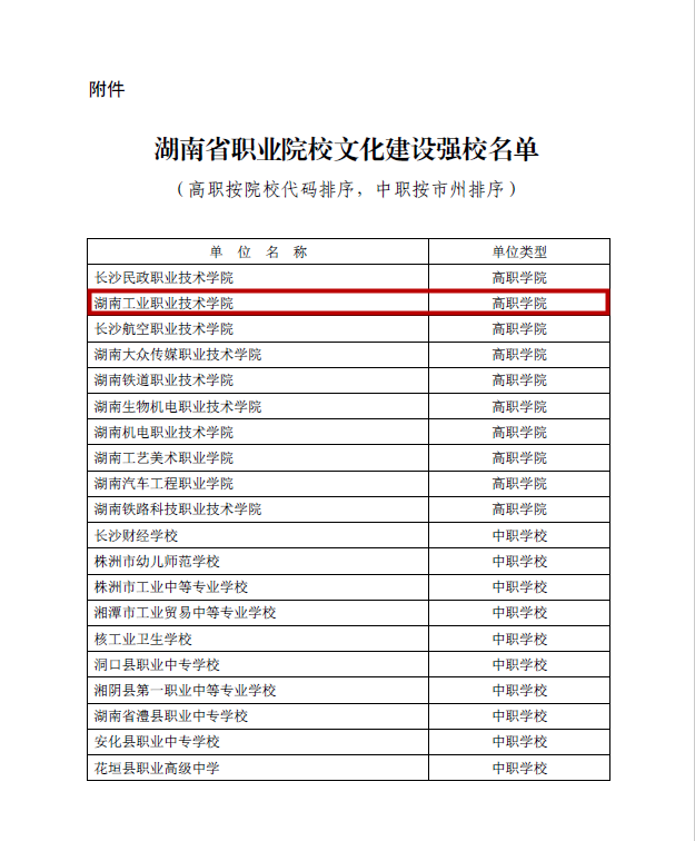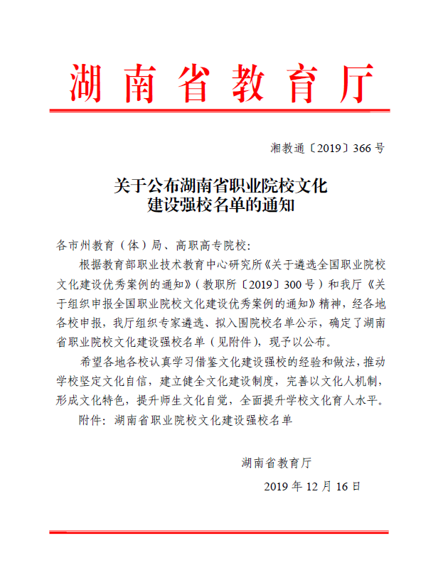 本网讯 12月16日,湖南省教育厅下发《关于公布湖南省职业院校文化建设强校名单的通知》(湘教通〔2019〕366 号),我校名列其中,成为湖南省首批文化建设强校,并推荐申报全国职业院校文化建设优秀案例遴选。