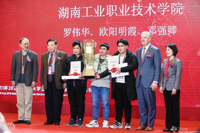 本网讯 2019年“TI杯”全国大学生电子设计竞赛颁奖暨总结大会近日在北京国家会议中心隆重举行。夺得大赛特等奖(高职高专组唯一最高荣誉)的我校电气工程学院欧阳明霞、罗伟华、邓强卿三位同学,赵自鹏、曾文琦两位指导老师及全国大学生电子设计竞赛组委会及专家组,全国一等奖获奖代表以及媒体代表等400余人参加了本次颁奖大会。中国科学院及中国工程院两院院士、全国竞赛组委会名誉主任王越院士为特等奖获得者颁奖。