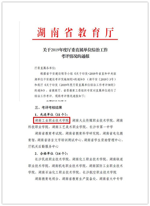 近日,湖南省委教育工委、省教育厅联合下发了《关于2019年度厅委直属单位综治工作考评情况的通报》,对11家先进单位、14家合格单位进行通报表彰。我校荣获2019年度厅委直属单位综治工作(平安建设)考评“先进单位”。