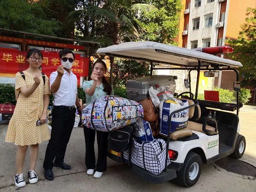 立体字前,毕业生纷纷拍照留念,跟老师不舍话别。校道上,爱心服务车来往穿行,帮助毕业生将一车车行李运送至校门口。下午4点学校的运送专车准时出发,送毕业生前往各个车站。学校食堂还增加了龙虾等特色菜品,让毕业生在温馨愉悦的就餐环境中吃好离校前的最后一餐。