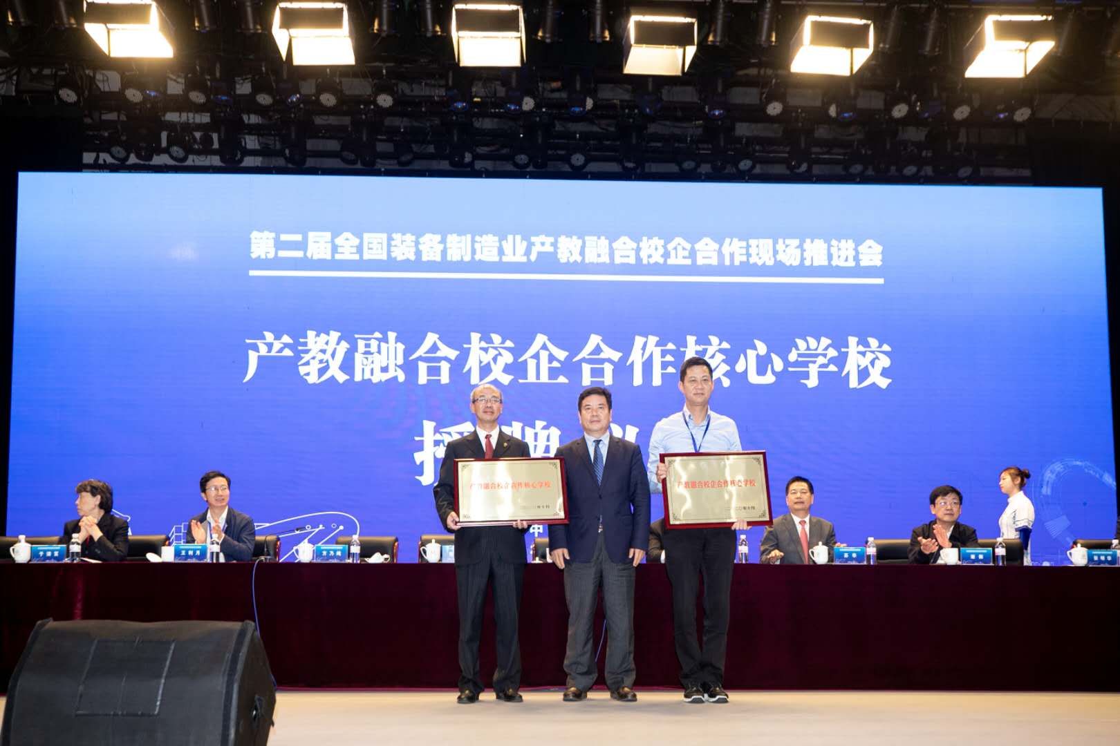 大会现场,我校校长向罗生(前右一)接受“中华职业教育社产教融合校企合作核心学校”授牌