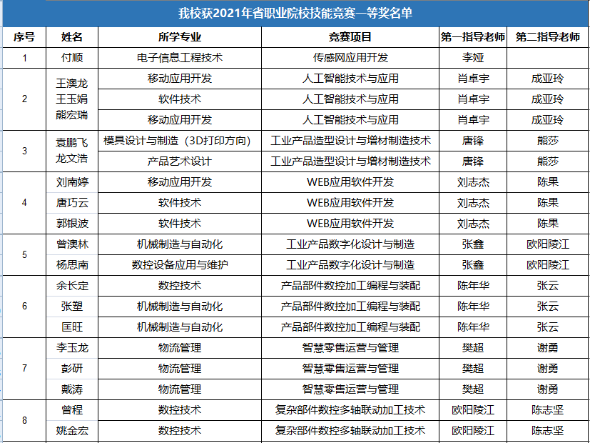 本网讯 近日,2021年度湖南省职业院校技能竞赛落下帷幕。本次比赛在全省56个赛点陆续举行,我校共派出88支参赛队263名选手参加49个项目的角逐,共揽获20项一等奖(与2020年相比增加6个)、22项二等奖、31项三等奖,成绩稳居全省前列(一等奖获奖情况附后)。
