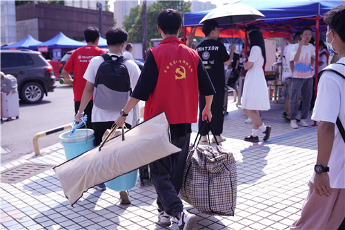 “同学,请出示行程卡、健康码以及48小时内核酸检测报告。”“同学,请在此处排队,乘坐大巴前往宿舍。”“因疫情原因,家长无法入内,可以先把行李寄存到此处。”……一遍遍、一趟趟,志愿者们用热情与耐心为新生们提供帮助。在校门口,学校还安排了摆渡车,免费托运新生行李至学生宿舍。各二级学院迎新报到点安排了大量工作人员帮助新生快速完成注册手续,解答新生遇到的各种问题。