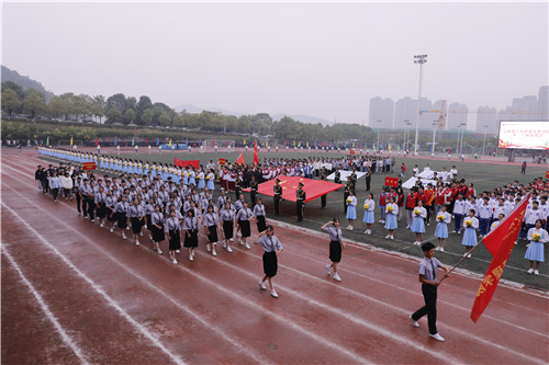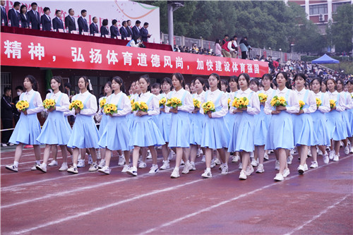在雄壮欢快的《运动员进行曲》声中,国旗礼仪队、彩旗方阵、会徽方阵、裁判员方阵、高水平运动队方阵、各二级学院代表方阵、各分工会教职工方阵依次出场。他们迎着秋日暖阳,迈着矫健的步伐,喊着响亮的口号,展现了我校师生昂扬向上的精神风貌。