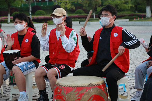 本网讯 4月20日下午,欢快的音乐、鼓点以及各种乐器声,伴随着阵阵欢声笑语,让新纪元广场热闹了起来,这是我校抗疫青年突击队的志愿者们在开展一场心理团建活动——鼓圈。