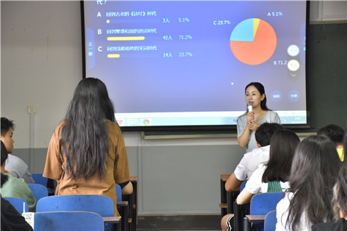 “如果可以穿越,你更愿意穿越回哪个时代?古老的诗经时代,繁盛似锦的唐诗时代,还是浅唱低吟的宋词时代。”基础课教学部陈琼老师的《文学欣赏》课通过课堂投票、吟唱《蒹葭》、小组闯关游戏等多样的互动方式,带领同学们领略《诗经》的魅力。