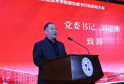 学校党委书记刘建湘致辞,他介绍了学校组织开展楚怡读书行动的背景,从“为什么读书”“读什么书”“怎样读书”三个方面做了分享,他指出领导干部要在读书中加强党性修养、坚定理想信念、提高精神境界;老师们要在读书中丰富知识、更新观念、提升能力;同学们要在读书中开阔视野、启迪智慧、陶冶情操。各二级学院要结合实际开展“一院一品”读书品牌建设,挖掘典型、树立榜样,形成“班班有活动、人人都参与”的活动机制。他希望学校师生争做“读书行动”的参与者、实践者、推广者,传承发扬“爱国、求知、创业、兴工”的楚怡职业教育精神,增强志气骨气底气,担起民族复兴的重任。