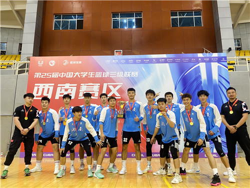 本网讯 近日,由中国大学生体育协会主办、广西体育高等专科学校承办的第25届中国大学生篮球三级联赛(西南赛区)在广西南宁落下帷幕。经过9天的激烈角逐,我校男篮不畏强敌、奋勇争先,一路过关斩将以6场全胜的优异成绩登顶西南赛区冠军,荣获“西南王”称号,同时获得参加今年6月全国总决赛的资格。