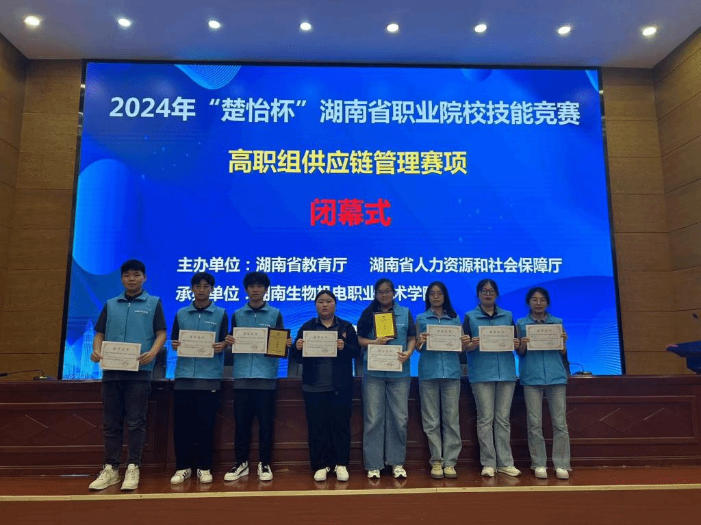 本网讯 6月2日,由湖南省教育厅、湖南省人力资源和社会保障厅主办,由湖南生物机电职业技术学院承办的“楚怡杯”湖南省职业院校技能竞赛高职组供应链管理赛项圆满结束。本次比赛为期两天,共有来自省内21个院校,共计42支队伍参赛,我校经济管理学院现代物流管理专业22级学生吕贤贤、蔡喜、杨慧娴、詹兰西(指导老师:宋聪、任志)和周志前、覃晶、仝宇栋、陈琼组成的两支参赛队伍(指导老师:龙婷、任志)分别以总分排名第三和第四的优异成绩荣获比赛一等奖,获奖队伍将有机会代表湖南省参加国赛。