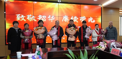 荣休教师所在分工会代表、青年教师代表发言,表达了对荣休教职工的感谢与祝福。现场举行了2024年教职工荣休仪式,与会领导为退休教职工送上鲜花,并进行合影留恋。