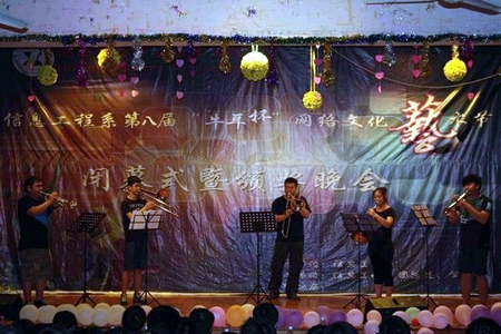 一段动感舞曲《兔子舞》拉开了晚会序幕。信息工程系副主任胡汉辉为晚会致辞,他对此次网络文化艺术节所取得的丰硕成果给予高度肯定,对默默付出的工作人员表示衷心的感谢。随后,晚会节目表演正式开始,《器乐铜管重乐》表演、精彩的街舞、爵士舞以及民族舞表演等把现场气氛推向了高潮。整场晚会高潮迭起,精彩纷呈,节目表演过程中还穿插了颁奖环节,现场领导和嘉宾为在本次艺术节中获奖的学生颁发了证书。