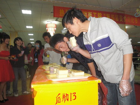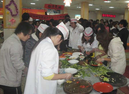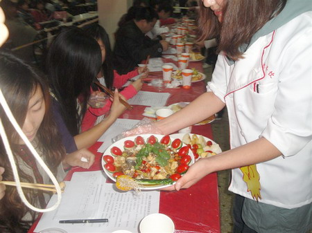 比赛现场同时进行的“欢乐大派送”则由大厨现场精制蛋糕,让同学们既饱了眼福又饱了口福。而一直穿插在其活动中的趣味游戏“谁是‘香肠王’”、“饮食猜猜猜”等也将现场高潮层层推进。