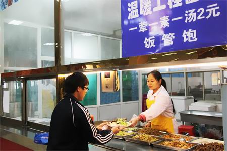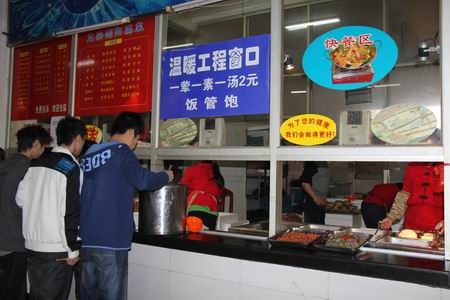 酸豆角炒肉、清炒小白菜、紫菜蛋花汤,机械工程系数控S09-1班周斌同学从“温暖工程”窗口服务员手中接过热腾腾的饭菜,他的心中此刻也洋溢着暖流。仅仅只需2元钱,这个来自贫困家庭的十九岁男孩就能吃饱吃好。这是笔者昨天在就餐时间从学生食堂“温暖工程”窗口见到的温馨一幕。