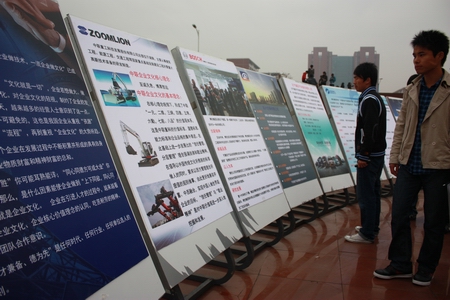 学生在企业文化展板前了解企业文化,挑选适合自己的用人单位