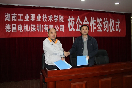 校企合作签约仪式现场,学院党委副书记周立华代表学院与德昌电机签订协议