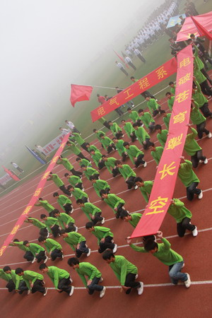 在激进昂扬的运动员进行曲中,伴随着入场解说,走在队伍最前列的是学院国旗队方阵和彩旗队方阵,在他们身后,刚从湖南省第九届大运会全胜归来的获奖队伍——我院田径代表队、女排代表队、男女篮球代表队,他们手捧奖杯、身披荣耀,向全院师生展示我院在大运会中取得的“金牌数量第一、女排第一、女篮第二、男篮第三、男子团体总分第一、女子团体总分第二”的好成绩。各系各专业的方阵队、代表队踏着坚定有力的步伐依次入场并接受主席台的检阅。他们矫健的步伐,响亮的口号,英姿飒爽的风采,充分体现了工院师生的精神面貌,缤纷的彩旗在红绿互动的辉映间,象征着工院希望的绽放和勃勃生机。