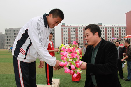 获奖选手从学院团委书记段可手中接过鲜花和获奖证书