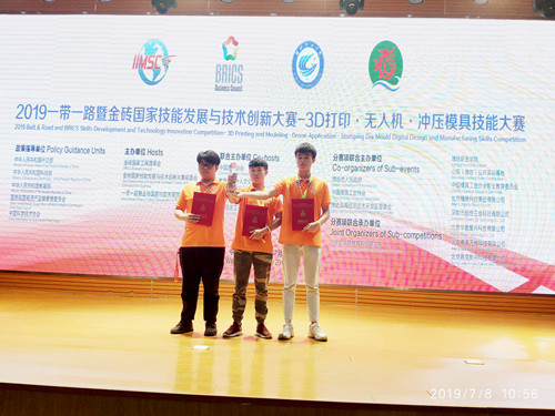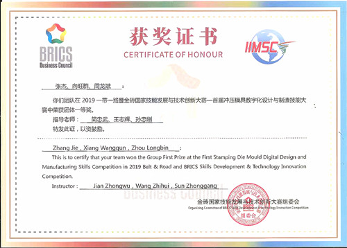 本网讯 7月5日至8日,2019一带一路暨金砖国家技能发展与技术创新大赛“冲压模具数字化设计与制造”赛项在山东举办。由我校汽车工程学院简忠武、王志辉、孙忠刚老师指导,张杰、向旺群、周龙斌同学组成的代表队以总分第一的成绩获得该赛项一等奖。我校被大赛组委会授予“最佳组织奖”,指导教师获得“优秀指导教师”称号。