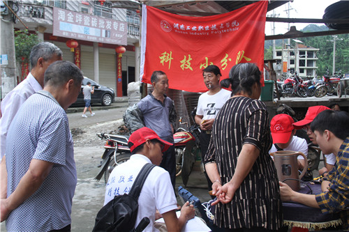 村民们得知集市上有家电义务维修活动,纷纷将家中有故障的电饭煲、热水壶、电风扇等电器送了过来。接过刚修好的电热水壶,张云华老人用当地方言说了好长一番话,志愿者们只模模糊糊听到“要多少钱”,志愿者们赶紧给这位老人解释道:“爷爷,我们是湖南工业职院开展义务维修活动的大学生,不要钱的。”老人不停地说着谢谢。