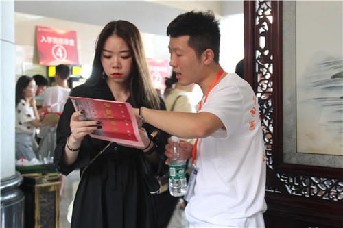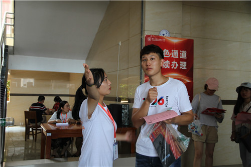 “请缴完费的同学拿着新生报到程序表到图书馆一楼北厅盖章。”机电18-1班的苏禧是迎新工作中的一名志愿服务者,为避免新生在排队缴费后产生再次排队的麻烦,从早上七点一直到下午五点,他几乎每隔一分钟就需要重复这一句话。他表示,“尽自己的力量去分担一份责任吧,看到学弟学妹们顺利报名后露出的笑容,一切努力都是值得的。”