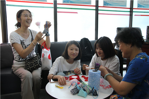 来自手工社的欧素云与同伴自备绸带、胶枪、雪点纱等材料,在老校区的离退休办公室里用一双巧手,做出了一朵朵“鲜花”,作为教师节礼物送给老教师们。“赶紧叫我的老姐妹来,这花她一定会喜欢。”“我可以带一朵回去吗?送给我老伴。”一朵朵美丽的花,伴随着阵阵欢声笑语,送到了老师们的手上。“我年轻的时候最喜欢干这个。”林金香老师看到同学们编花时,也在旁边跟着学了起来。“能够通过手工给老师们带来快乐送上祝福,看到他们满意灿烂的笑容,我们也很开心。”欧素云表示。