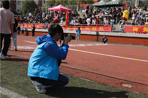 大学生记者团的“记者们”为记录大家在赛场上奋力拼搏的风貌及夺得成绩时喜悦的瞬间,他们来回奔波,认真抓拍,采访。主席台上广播站的同学们不间断地朗诵加油稿,播报体育项目和比赛成绩,他们用声音传递观众们为场上运动员们加油的热情和祝福。