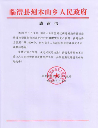 本网讯 3月9日,我校商务贸易学院2018级市场营销专业学生谭骏文通过国外朋友采购了1000个普通医用外科口罩,赠送给家乡抗疫一线的工作人员。湖南临澧县刻木山乡人民政府接收了物资捐赠并发出感谢信表示感谢。