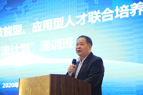 本网讯 9月24日上午,由中国教育国际交流协会主办,湖南省教育国际交流协会承办,我校协办的2020年首期“高端技能型、应用型人才联合培养百千万交流计划”混训班开班仪式在我校隆重举行。中国教育国际交流协会职培部副主任何培,湖南省教育厅国际交流处处长周芳友、湖南省教育国际交流协会副会长杨栋梁、我校党委书记刘建湘、副校长董建国以及来自全国各高职院校的80名老师参加了开班典礼。