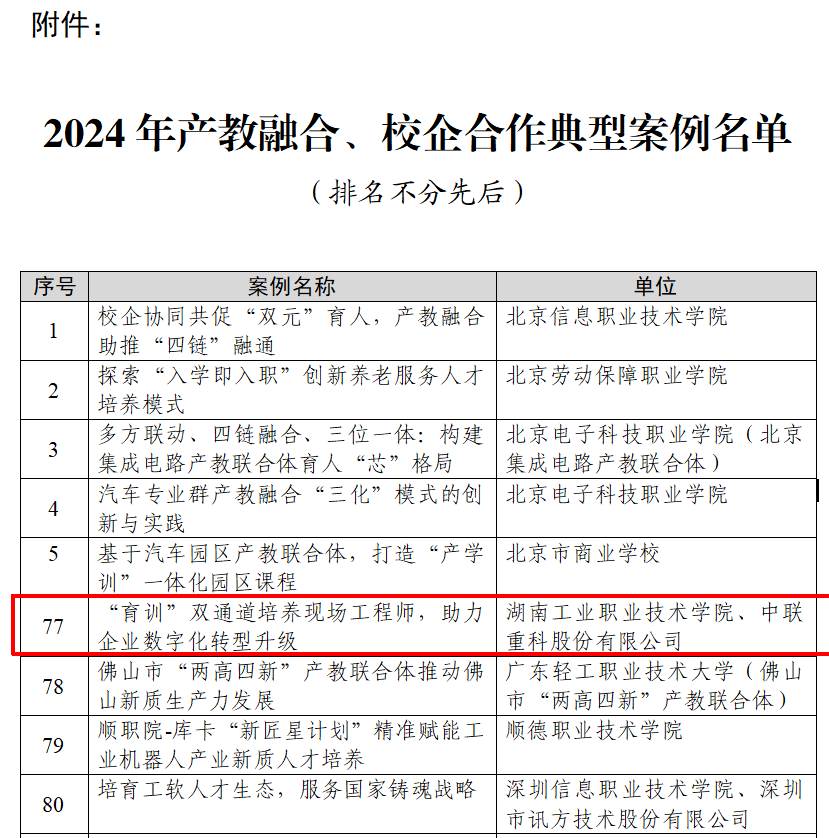 本网讯 近日,教育部公布了2024年产教融合、校企合作典型案例遴选结果,九游·官方网站和中联重科股份有限公司提交的《“育训”双通道培养现场工程师,助力企业数字化转型升级》成功入选。