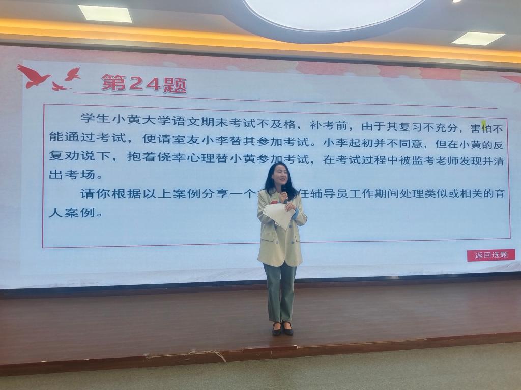在“育人案例分享”赛场,选手抽取案例题目,围绕学生情感生活、学业指导以及就业创业等日常问题进行分析,关联自身工作经历,通过“案例背景-育人过程-成效启示”的逻辑脉络,将个体经验提炼为可复制的育人范式,赢得了评委“既有理论高度,又具实践温度”的高度评价。