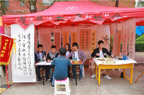 在招新现场,各社团成员热情宣传,积极为学弟学妹答疑解惑,不少社团还通过现场表演节目彰显其独特魅力:起点音乐协会一首《爱是怀疑》点燃了整个招新现场气氛,骑行协会表演的花式骑单车引得不少新生围观,楚艺书画协会、手绘社等社团招新台前展示了最新的学生作品,棋协社成员则以“棋”会友、乐在其中,电子协会也摆出了自制的电子元件小成果。
