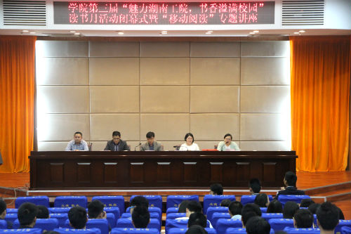 本网讯 5月26日,由我院图书馆、院团委联合举办的“魅力湖南工院 书香溢满校园”读书月活动闭幕式暨“移动阅读”专题讲座在图书馆多功能报告厅举行。信息中心副主任周猷、院团委副书记李陟威、读者协会指导老师李雪艳、北京超星树图信息技术有限公司经理廖焱森出席本次活动。图书管理员杨贝莉担任主持人。