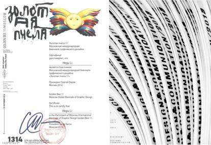 作为与纽约艺术指导协会(ADC)年度奖、英国D&AD设计奖、美国SEGD环境图形设计奖、美国One Show广告奖并列为世界五大顶级赛事之一,同时由ICOGRADA国际平面设计协会与IBCC国际双年展协调委员会支持认可的顶级赛事,自1992年创立起,GoldenBee莫斯科金蜂国际平面设计双年展至今已进入第十一届。李河谕老师作品于2014年11月在第11届莫斯科金蜜蜂国际平面设计双年展中展出,并被其永久收藏并出版。