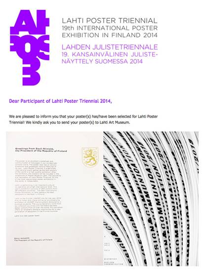 《Dicovery》还成功入选了2014年第十九届芬兰拉赫蒂国际海报三年展。芬兰拉赫蒂国际海报三年展与“日本富山国际海报双年展”、“波兰华沙国际海报双年展”、“墨西哥国际海报双年展”、“美国科罗拉多国际海报双年展”并列为世界五大权威海报年展,被誉为艺术设计界的“奥斯卡”,同时它属ICOGRADA(国际平面设计师协会)认可的世界顶级海报赛事。本次芬兰拉赫蒂国际海报三年展共收到来自全球45个国家、地区设计师递交的海报作品5836件,经国际评审团评议,最终286件海报作品被芬兰拉赫蒂海报博物馆展出并永久收藏。